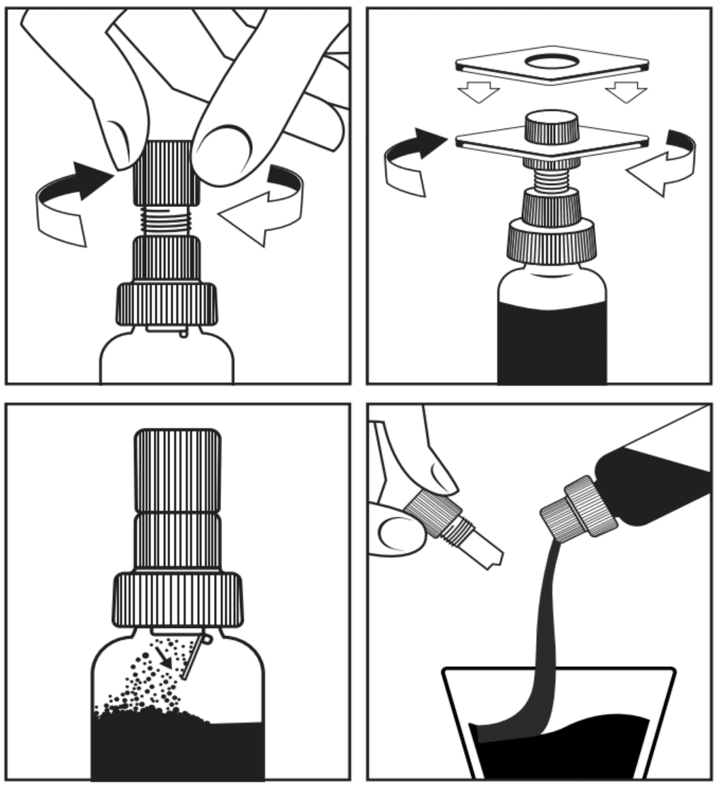 Desenroscar el tapón y beber la preparación obtenida, directamente del vial o disuelta en un poco de jugo o leche. En caso de que la posología indicada sea de 100mg, beber la preparación obtenida hasta la marca del vial que indica la mitad del contenido.