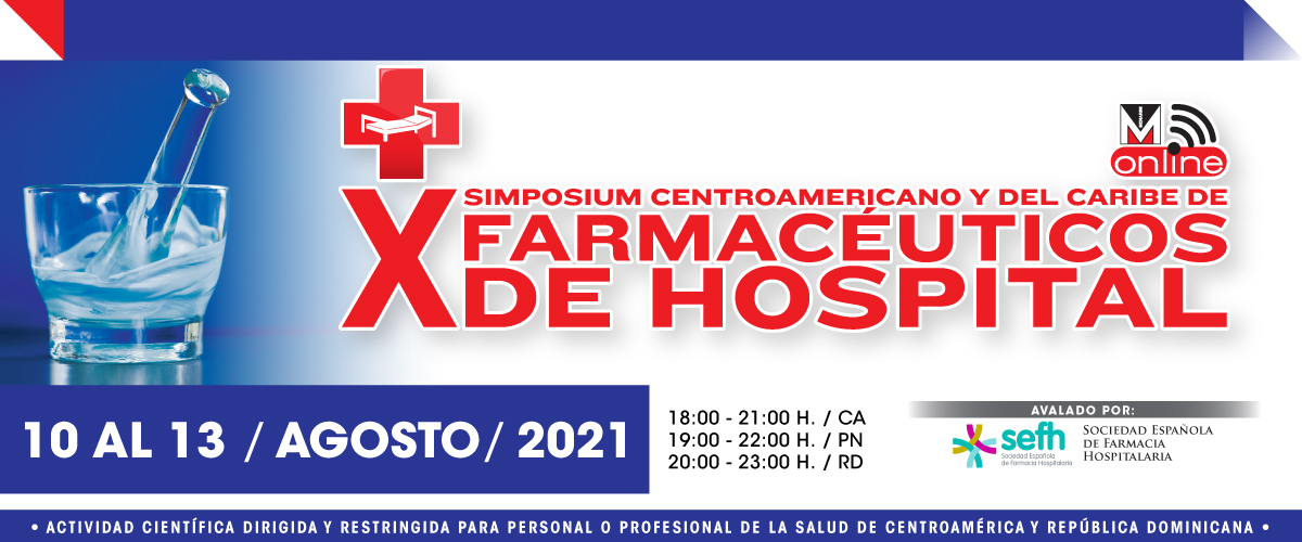 El X Simposium Centroamericano y del Caribe de Farmacéuticos de Hospital se realizará el del 10 al 13 de agosto iniciando a las 18:00 hrs. de Centroamérica, 19:00 hrs. de Panamá, y 20:00 hrs.en República Dominicana, y contará con la presencia de notables conferencistas de reconocimiento internacional y regional.