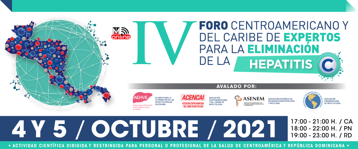 El IV Foro Centroamericano y del Caribe de Expertos para la Eliminación de la Hepatitis C se realizará el 4 y 5 de octubre de 2021 iniciando a las 17:00 hrs. de Centroamérica, 18:00 hrs. de Panamá, y 19:00 hrs.en República Dominicana, y contará con la presencia de notables conferencistas de reconocimiento internacional y regional.