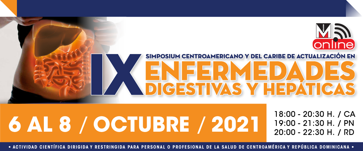 El  IX Simposium Centroamericano y del Caribe de Actualización en Enfermedades Digestivas y Hepáticas del 6 al 8 de octubre iniciando a las 18:00 hrs. de Centroamérica, 19:00 hrs. de Panamá, y 20:00 hrs.en República Dominicana, y contará con la presencia de notables conferencistas de reconocimiento internacional y regional.